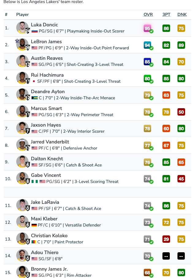 2K26湖人全队能力值出炉:东契奇95詹姆斯94领衔